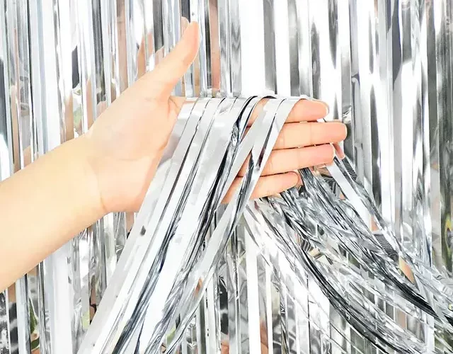 Уникальная фольгированная шторка под серебро для декора фотозон и кенди-баров – праздник, шик, блеск и хорошее настроение. Этот элемент декора для праздников представляет собой полотно из металлизированной пленки, разрезанной на тонкие полосы.
